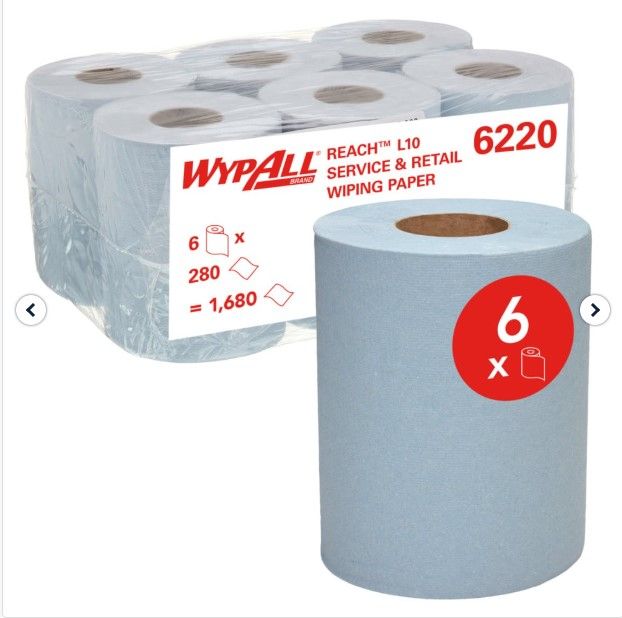 WypAll® Brand Professional Wiping Paper products are designed for the specific environments where they will be used, to deliver on your wiping task, every time. These blue, 1 ply, single use Retail & Service Centrefeed rolls are small, easy to handle and designed for light-duty surface wiping. These rolls are perfect for use in retail and service environments and our unique Airflex™ technology delivers exceptional strength and absorbency. These rolls are designed specifically for the portable single-sheet WypAll® Reach™ dispenser (6221) which ensures the rolls remain clean and enclosed to help prevent against transmission of food-borne bacteria. Individual sheet size 38cm (L) x 18.5cm (W). 6 rolls x 280 sheets, 1 ply, blue (1,680 total)