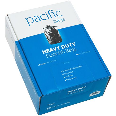 This flatpacked rubbish bag dispenser box provides an ideal storage solution for bags. The 82L black bag is equipped with exceptional stretch and strength ensuring toughness and tear resistance for heavier loads. The starsealed feature effectively eliminates leaks providing added assurance.