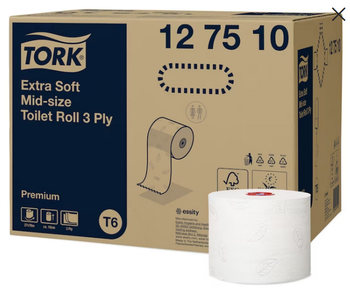 - Tork T6 Premium 3ply Soft Mid-size Toilet Rolls Ctn/27 (127510)