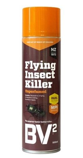 This BV2 Flying Insect killer is a Dual Action formulation which is MPI Approved and a recognised border bio-security chemi-tool for use in devanning shipping containers. It is designed to knock down flying insects fast and stops insects with a single blast, providing long-life residual properties. It is a dry spray which quickly kills flies, mosquitoes and other insects without risk of staining fabrics or walls. Safe to use in food preparation areas, lunch bars, motels, hotels, freezing works and hospitals and is NZFSA approved.