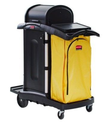 The High-Security Janitorial Cleaning Cart is a secure cart, featuring quiet casters and ball-bearing wheels along with a preassembled locking hood and doors. 0.2 - cubic metre storage capacity offers 40% more space than traditional carts so user spends less time retrieving supplies and more time completing the task at hand. Preassembled locking security hood speeds up assembly and ensures all products will be secure. Secure cabinet doors keep cleaning supplies concealed from view and locked up when carts are unattended. Mop bucket platform with securing grooves keeps WaveBrake® or microfiber charging buckets securely attached to cart. Durable 20.3cm ball bearing wheels and quiet 10.2cm casters make maneuverability easy and quiet for workers.