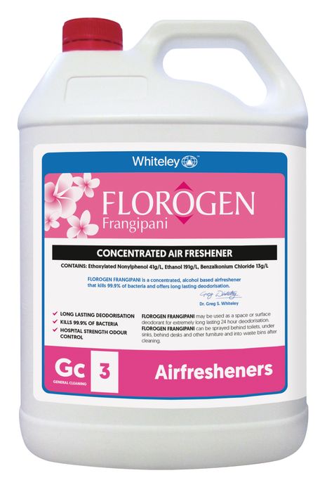 Florogen Frangipani removes unwanted odours and provides a positive method for increasing hygiene in the immediate area of use. Florogen Frangipani has a pleasant fragrance.