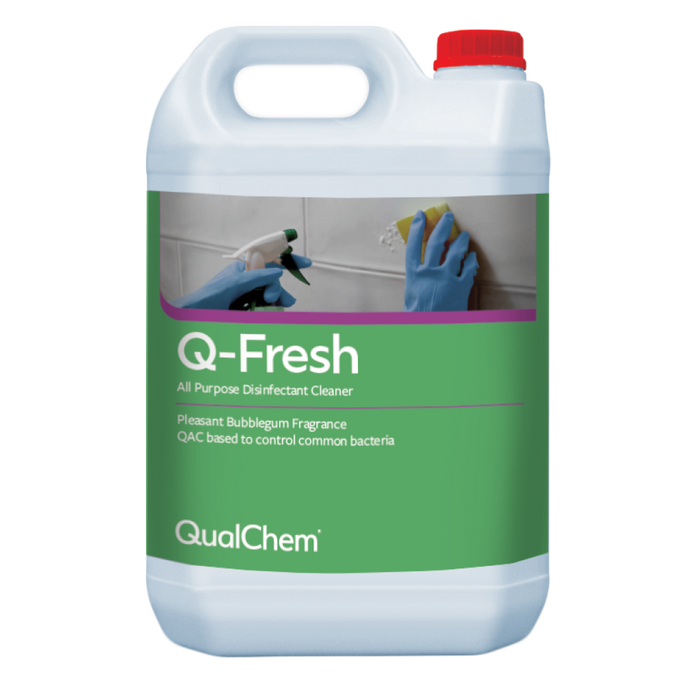 Q-FRESH 5L is a clear green perfumed mildly alkaline germicidal liquid disinfectant/detergent containing a QAC type disinfectant (Alkyl Benzyl Dimethyl Ammonium Chloride - known as benzalkonium chloride).