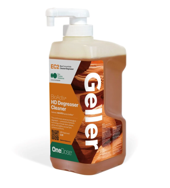 Geller OneDose EC2 BioActiv HD Degreaser/Cleaner uses advanced synbiotic technology to break down grease, grime, and biofilms on hard surfaces and floors. This eco-preferred concentrate tackles medium to heavy soils with a powerful blend of probiotics, prebiotics, and low-foaming biodegradable surfactants. It keeps cleaning long after use, without harsh residues or fumes. Ideal for kitchens, food areas, and industrial spaces.