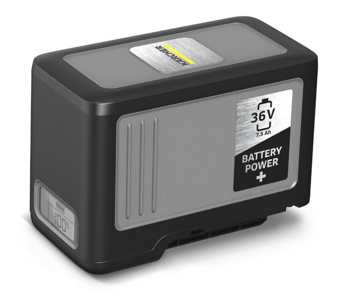 Protected by a high-quality, ultra-robust, impact-resistant casing with IPX5 protection, our Kärcher Battery Power+ 36 V lithium-ion battery with a capacity of 7.5 Ah combines high performance and impressive endurance. Developed for Kärcher cleaning machines in the 36 V battery platform, the battery has a wide range of protective mechanisms. For instance, integrated voltage monitoring and overcurrent protection reliably prevent damage to cells caused by deep discharge, overvoltage or overcurrent. Efficient temperature management continuously monitors the battery temperature and ensures reliable heat regulation so that the maximum possible power can be delivered at all times. Thanks to the Real Time Technology, the remaining running time, charging time and charge level can always be read on an LCD display.