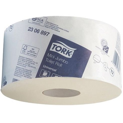 These mini jumbo toilet rolls are part of Tork's T2 range. Balancing cost and performance compared to standard toilet rolls, the mini jumbo system is perfect for medium to high-traffic locations. The universal rolls are the most economical in the range offering a good quality paper at an affordable price.
